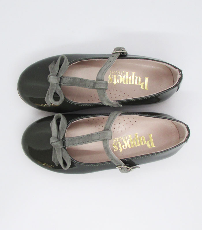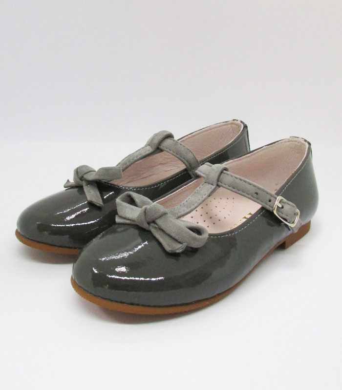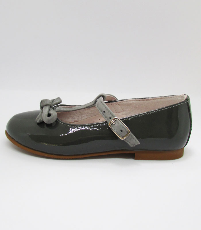 Mercedita color gris que combina charol y tira central con lazo tejido suave. Se abrocha con hebilla.