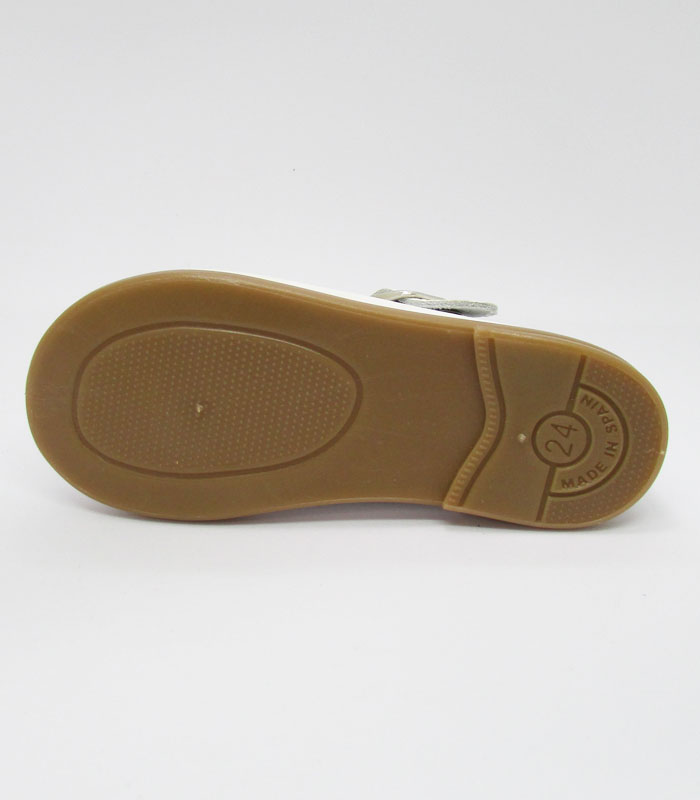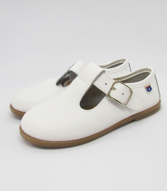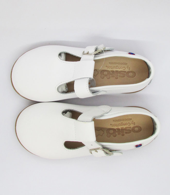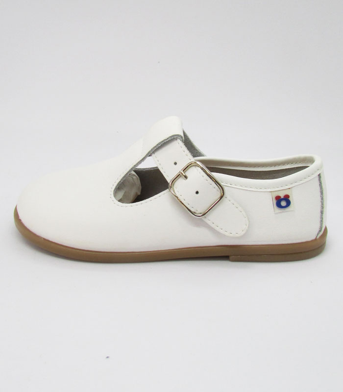 Pepito blanco. Cierre con hebilla y suela de goma antideslizante.