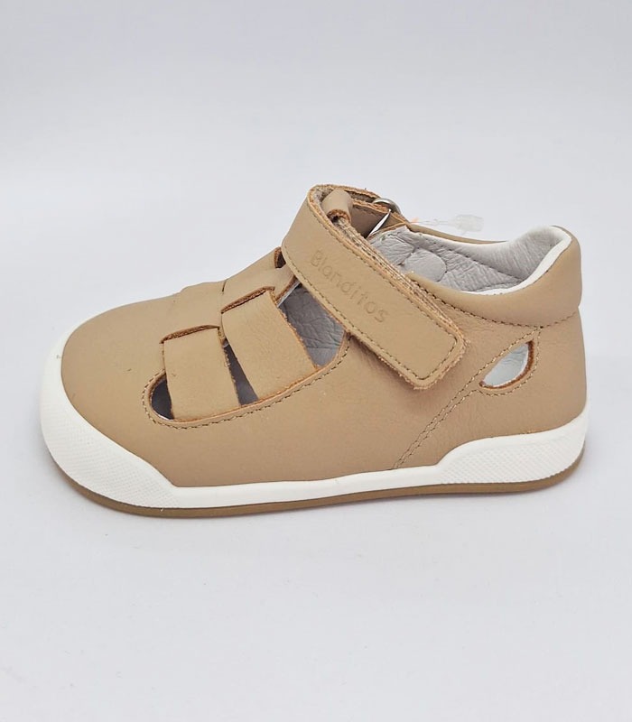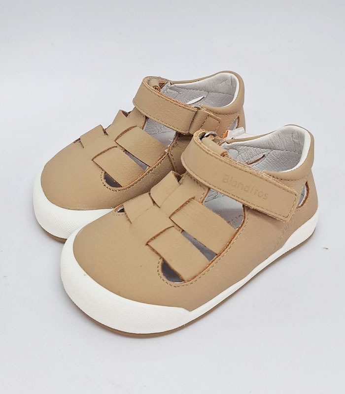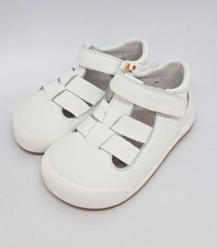 Sandalia fabricada en España por Blanditos by Crio´s super flexible. Sin ningún tipo de contrafuerte, cierre velcro para facilitar la autonomía, suela igual por delante que por detrás y puntera de goma para hacerlas más resistentes.