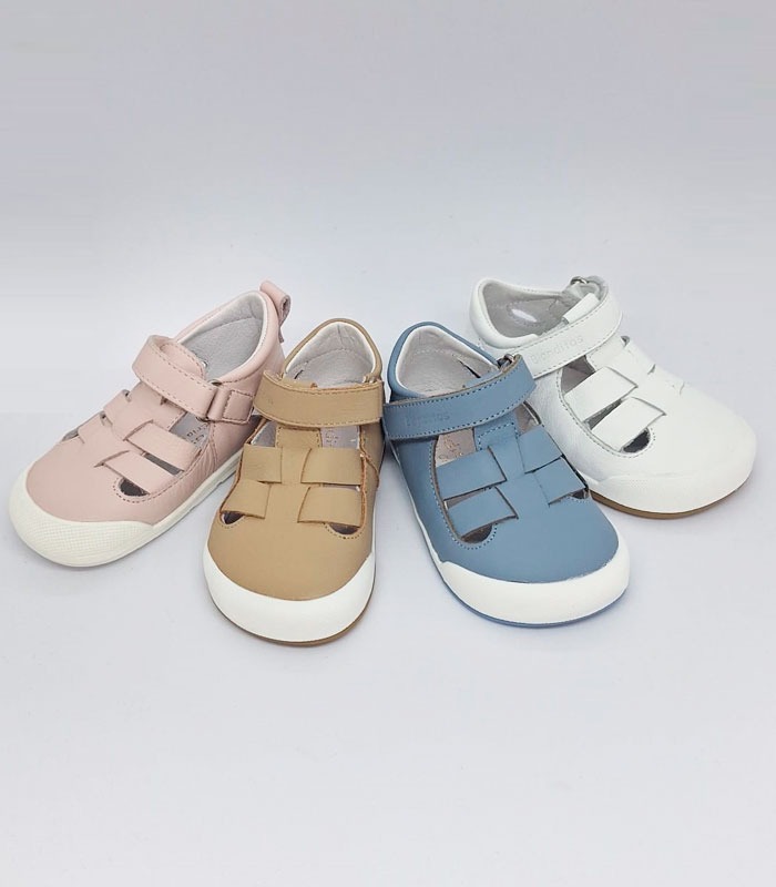 Sandalia fabricada en España por Blanditos by Crio´s super flexible. Sin ningún tipo de contrafuerte, cierre velcro para facilitar la autonomía, suela igual por delante que por detrás y puntera de goma para hacerlas más resistentes.